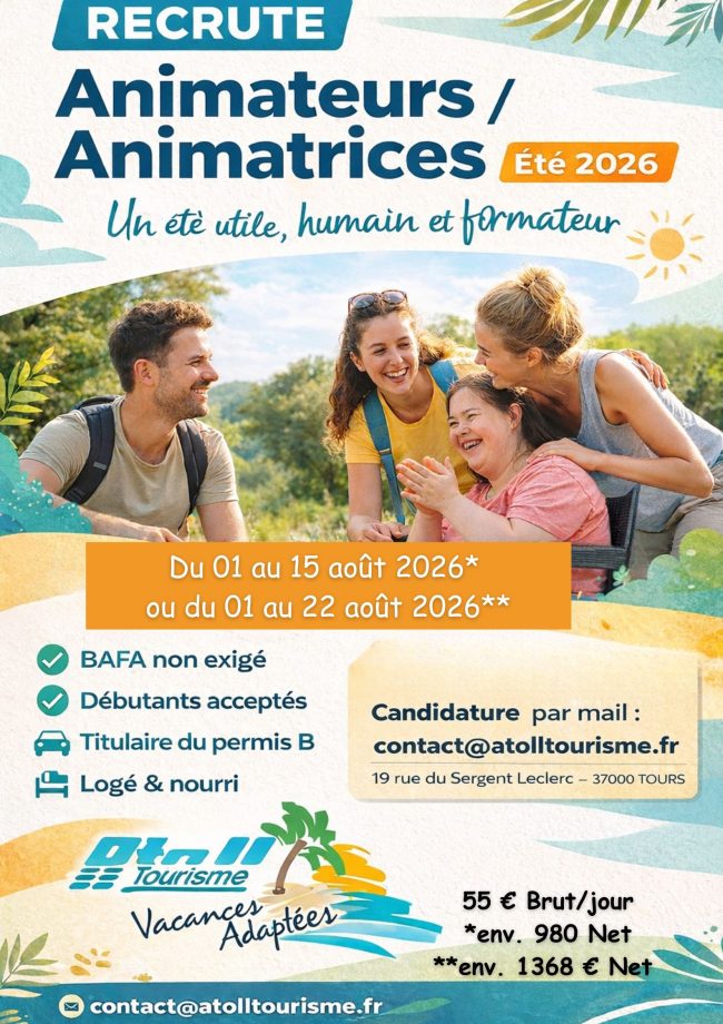 Atoll Tourisme recrute dès maintenant des animateurs·trices pour l’été 2026, pour des séjours adaptés avec des adultes. 👉 Candidatures ouvertes dès maintenant – infos dans la rubrique Recrutement.